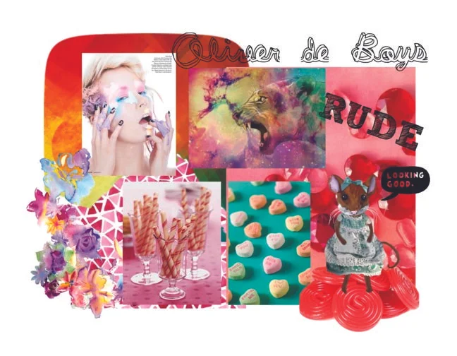 As an exercise in mood, tone, and character rendering, I put together six mood boards, each for a character from Shakespeare's As You Like It. These mood boards then became unconventional character renderings in the form of paper dolls. The overall concept for the play setting and costumes is an enchanted candyland, where the styling is pastel-goth inspired and the colors of court are entirely grayscale in comparison to the lively candy forest where the cast makes it's most character development.